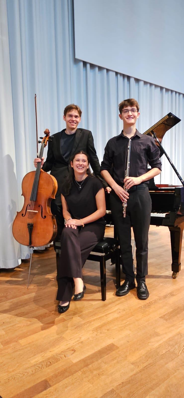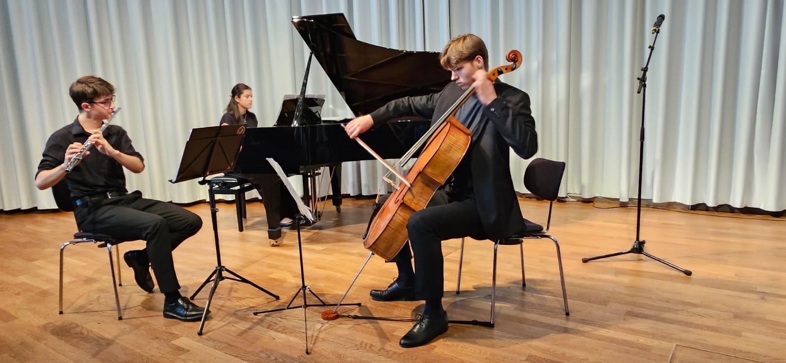 n Klavier, Gitarre, Querflöte und Cello und ein Kammermusikensemble tritt auf .